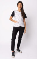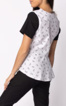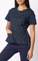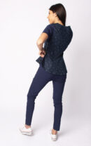 La chaqueta tiene cuello redondo, con un cierre lateral y en la parte trasera un vuelo que le da elegancia y feminidad. El pantalón es corte babucha. En la cintura lleva elástico, y dos profundos bolsillos a los costados.